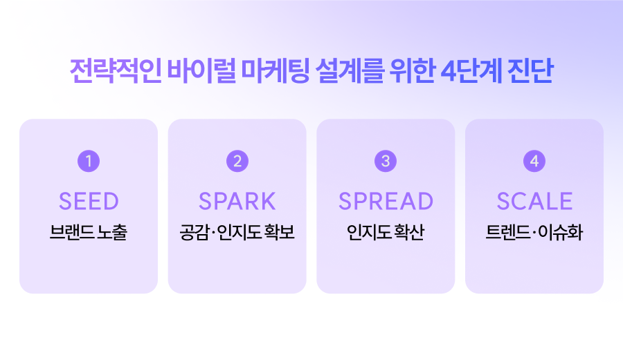 바이럴 마케팅 광고는 위와 같이 다양한 유형을 다루지만, 공통적으로 ‘소바자가 어떻게 자발적으로 콘텐츠 확산에 참여할 것인가’를 기반으로 전략을 수립해야 해요. 때문에 진행하기 전 대행사는 시장 현황, 브랜드 감성, 타겟 등 정교한 분석이 필수죠.