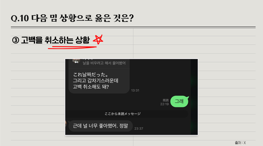 🔔 Q.10 다음 중 밈 상황으로 옳은 것은? (정답 : ③고백을 취소하는 상황)