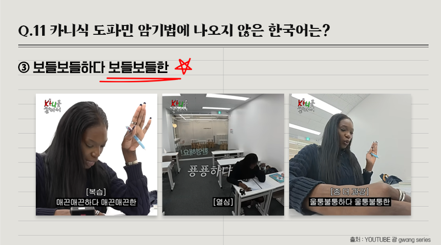 🔔 Q.11 카니식 도파민 암기법에 나오지 않은 한국어는? (정답 : ③보들보들하다 보들보들한)