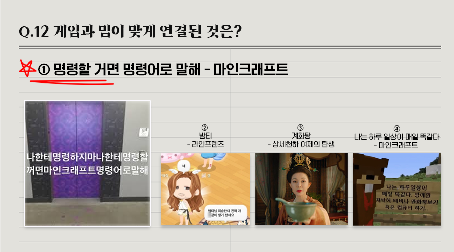 🔔 Q.12 게임과 밈이 맞게 연결된 것은? (정답 : ①명령할 거면 명령어로 말해 – 마인크래프트)