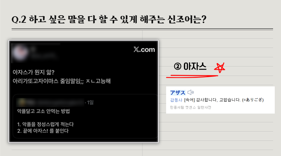 🔔 Q.2 하고 싶은 말을 다 할 수 있게 해주는 신조어는? (정답 : ②아자스)