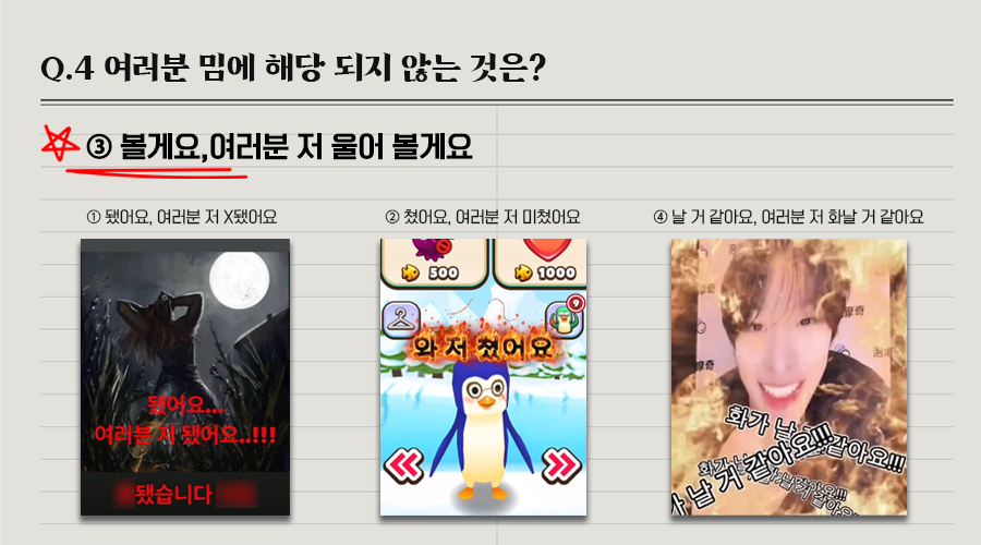 🔔 Q.4 여러분 밈에 해당 되지 않는 것은 (정답 : ③볼게요, 여러분 저 울어 볼게요)