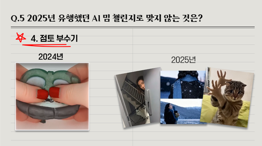 🔔 Q.5 2025년 유행했던 AI 밈 챌린지로 맞지 않는 것은? (정답 : ④점토 부수기)