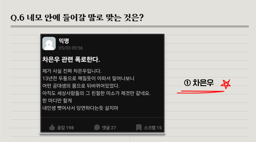 🔔 Q.6 네모 안에 들어갈 말로 맞는 것은? (정답 : ①차은우)