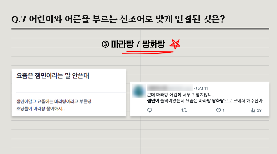 🔔 Q.7 어린이와 어른을 부르는 신조어로 맞게 연결된 것은? (정답 : ③마라탕/쌍화탕)