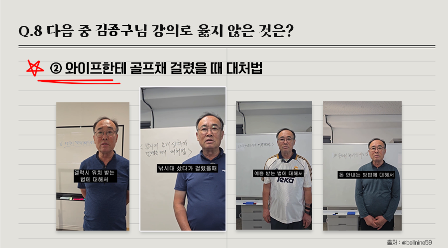 🔔 Q.8 다음 중 김종구님 강의로 옳지 않은 것은? (정답 : ② 와이프한테 골프채 걸렸을 때 대처법)