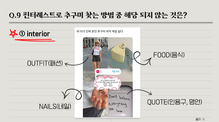 🔔 Q.9 핀터레스트로 추구미 찾는 방법 중 해당 되지 않는 것은? (정답 : ①Interior)