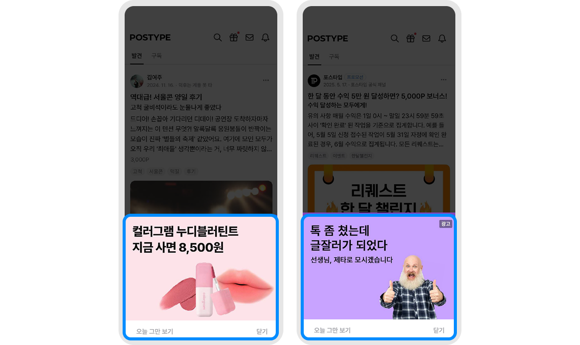 콘텐츠 소비 흐름을 해치지 않아 유저의 거부감은 낮추고, 실질적인 클릭과 전환 반응을 효과적으로 유도합니다.