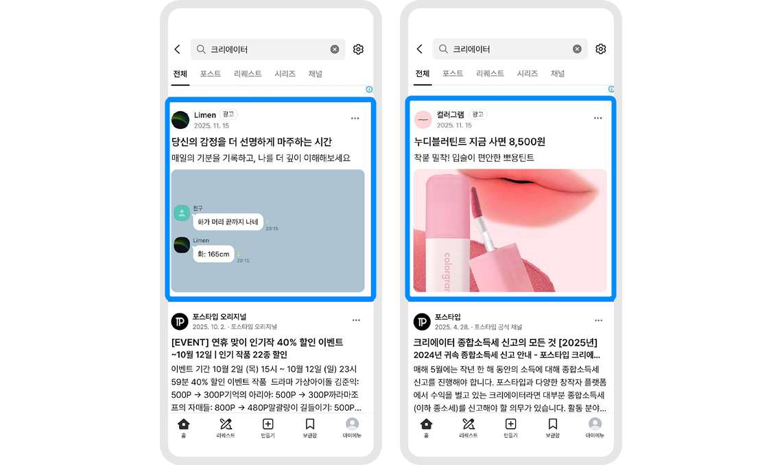 매월 12만 개의 신규 포스트가 생성되는 피드 지면에 콘텐츠와 유사한 형태로 자연스럽게 노출됩니다.