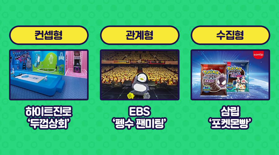 마지막으로 수집형은 특정 물건이나 경험을 수집하며 만족하는 유형으로 띠부띠부씰 열풍을 일으킨 삼립 '포켓몬빵'이 대표적인 사례에요. 지난해 띠부씰이 얼마나 인기였는지 '빵'은 먹지 않고, '띠부씰만 모은다'라는 이야기가 나올 정도였다니깐요~